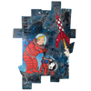 Cette œuvre unique met en scène, sur un support découpé aux lignes dynamiques, l’un des duos les plus iconiques de la bande dessinée, réinterprété dans un style vibrant et résolument moderne. La composition mêle l’énergie des couleurs éclatantes, la profondeur d’un ciel spatial riche en textures et l’élégance d’une esthétique urbaine, faisant dialoguer nostalgie et création contemporaine.